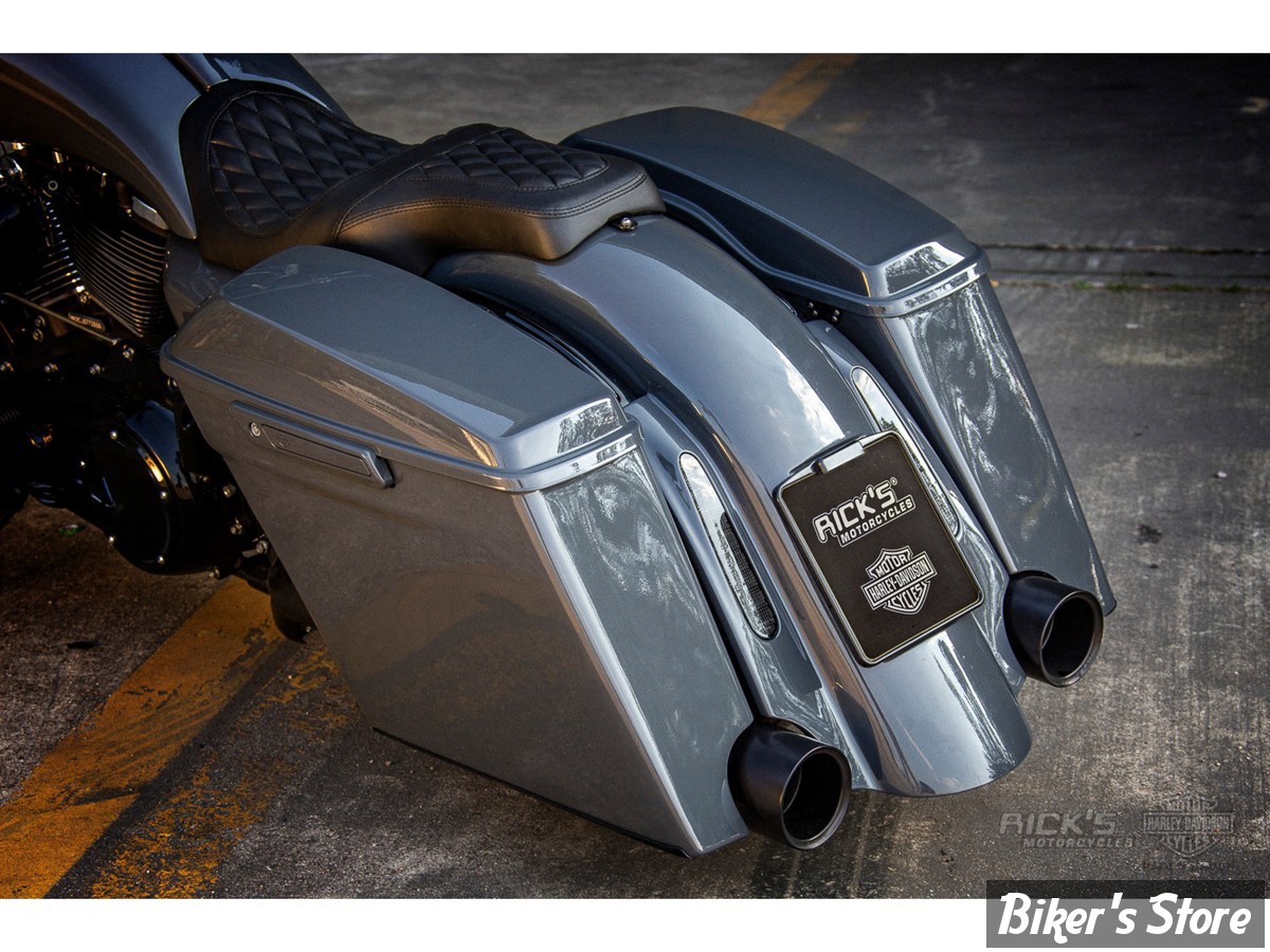 Ces corps de sacoches en fibre de verre et garde-boue arrière assorti sont fabriqués dans des moules de précision par Rick's. Ils remplacent parfaitement les sacoches d'origine et mesurent 4,2" (10,7cm) de plus que celles d'origine.