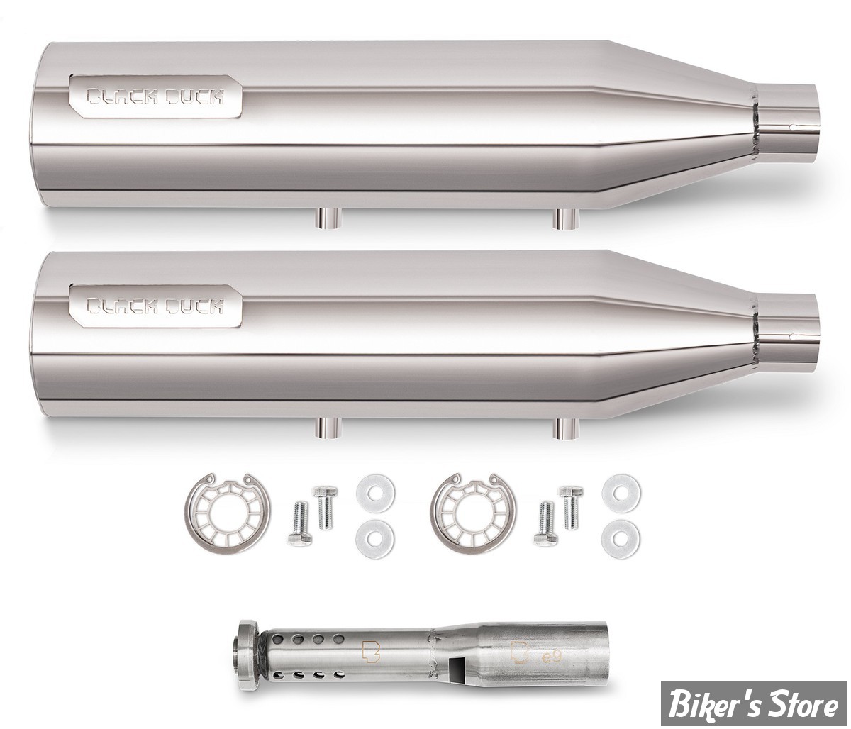 Les silencieux Black Duck en inox sont conçus à Barcelone et fabriqués en Espagne avec des matériaux et des techniques avancées pour maximiser la puissance et le rendement du moteur. Ils font 10cm de diamètre se fixent directement sur les collecteurs d'origine et laissent les repose-pieds passager en position d'origine. Les silencieux sont équipés de silencieux dB-killers fixes. Pour une utilisation sur circuit, ces composants peuvent être retirés, mais cela nécessite des modifications permanentes du système d'échappement. Cela garantit un son profond et rauque, mais annule l'homologation européenne.