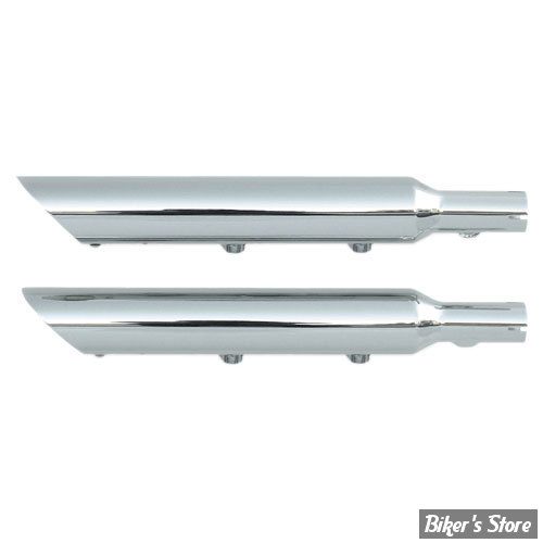 Rush propose une large gamme de silencieux : Slash Down, Slash Out, Straight Cut ou avec embouts interchangeables, en noir ou chromé. La gamme de chicanes, interchangeables, est assez large aussi 1,5'', 1,75'', 2'' et 2,25''. Fabriqué aux USA.