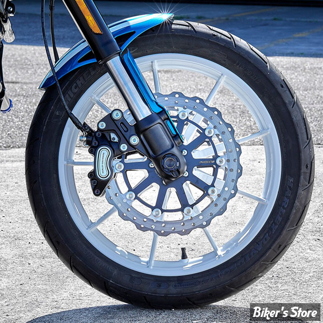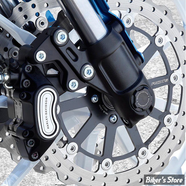 Côté DROIT & GAUCHE - Pour l'adaptation d'un disque de 13" - Pour Softail avec fourche inversée 18-20 FXFB Fat Bob ; 20-24 FXFBS Fat Bob S ; 20-25 FXLRS Low Rider S à partir de 2020 ; FXLRST Low Rider ST à partir de 2022. Le Kit